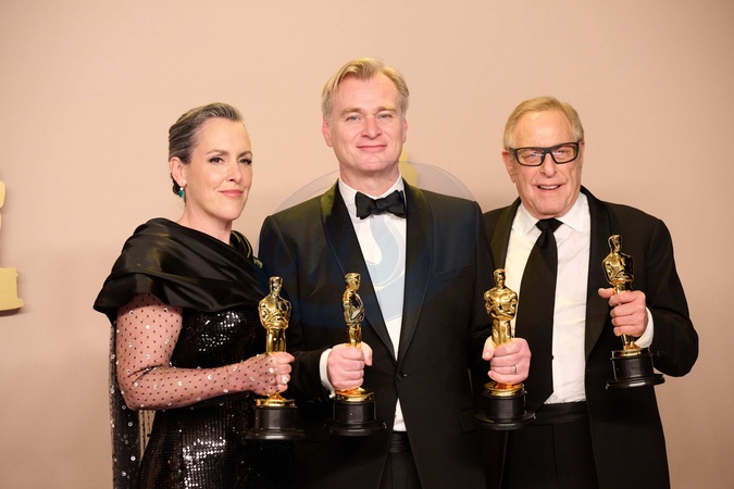 Emma Thomas, Christopher Nolan and Charles Roven pose backstage with the Oscar® for Best Picture during the live ABC telecast of the 96th Oscars® at Dolby® Theatre at Ovation Hollywood on Sunday, March 10, 2024., Credit:Avalon.red / Avalon