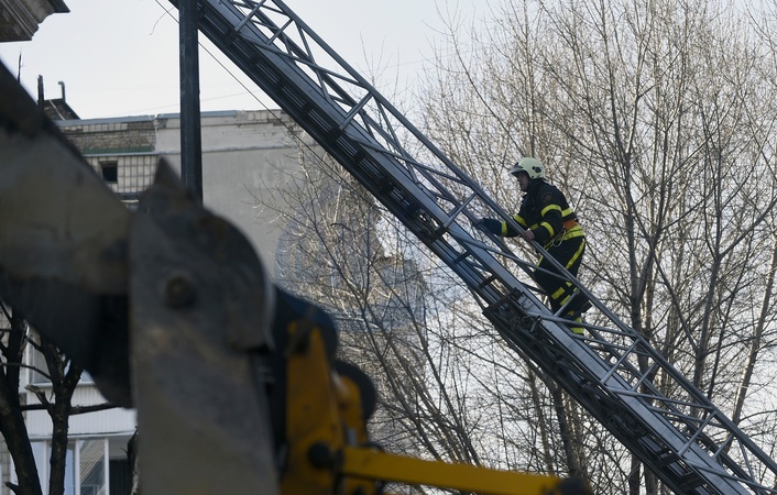 KYIV, UKRAINE - MARCH 21, 2024 - A firefighter eliminates the consequences of Russian shelling in Shevchenkivskyi district of Kyiv, capital of Ukraine., Credit:Ruslan Kaniuka / Avalon