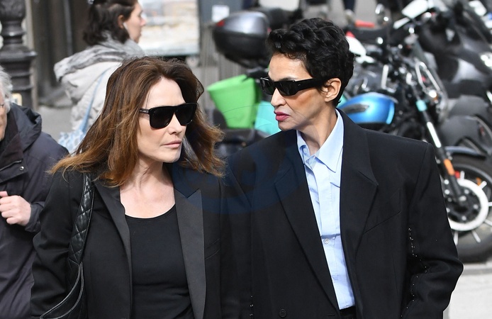 Carla Bruni et Farida Khelfa - Arrivées aux obsèques de Jean-Yves Le Fur en l'église Saint-Roch à Paris, le 6 avril 2024. The funeral of Jean-Yves Le Fur at the Saint-Roch church in Paris, April 6, 2024.