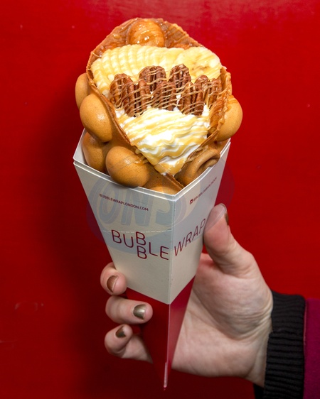 Vanilla Crunch Bubblewrap Waffle with vanilla gelato, banana, pecan and salted caramel at Bubblewrap in Chinatown, London, United Kingdom., Credit:Mario Mitsis / Avalon