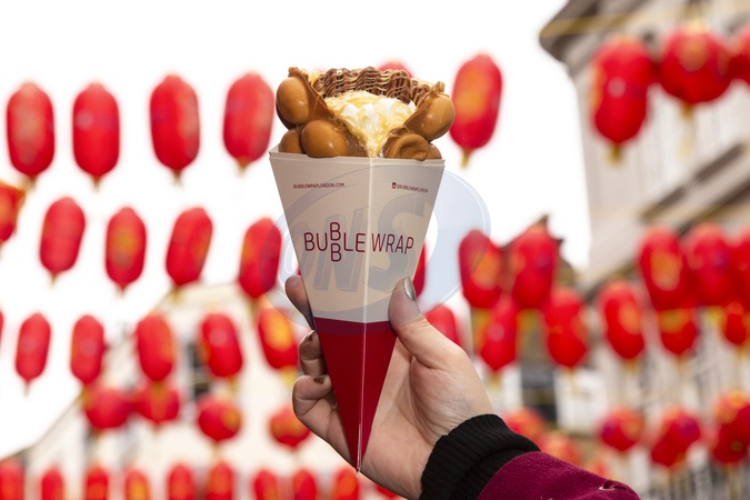 Vanilla Crunch Bubblewrap Waffle with vanilla gelato, banana, pecan and salted caramel at Bubblewrap in Chinatown, London, United Kingdom., Credit:Mario Mitsis / Avalon