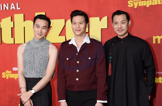 Duy Nguyen, Hoa Xuande and Fred Nguyen Khan arriving at HBO's "The Sympathizer” Premiere Red Carpet held at the Paramount Theater in Los Angeles, CA on April 9, 2024. © Janet Gough / AFF-USA.COM