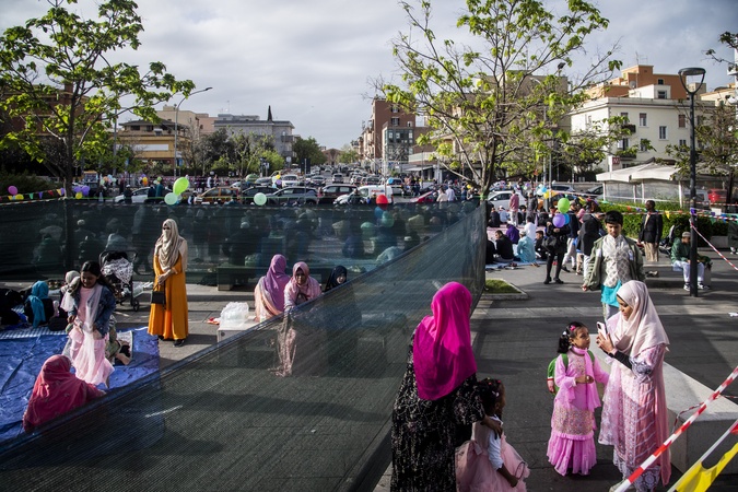 Muslim devotees pray for the end of Ramadan, in the Prenestino district of Rome, Credit:Alessandro Serranò / Avalon