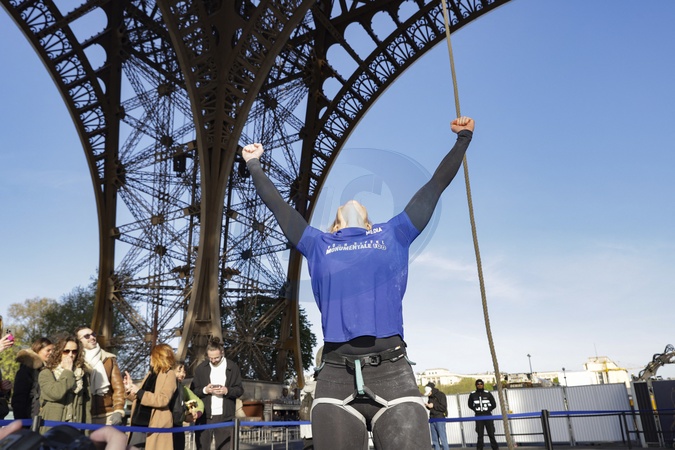 Anouk Garnier, la double championne du monde de saut d'obstacles a gravi à la corde les 110 mètres jusqu'au deuxième étage de la tour Eiffel