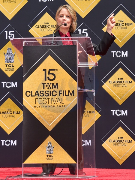 HOLLYWOOD, LOS ANGELES, CALIFORNIA, USA - APRIL 19: Jodie Foster speaks onstage during the 15th Annual TCM Classic Film Festival 2024 - TCM Hosts Handprint And Footprint Ceremony Honoring Jodie Foster held at the TCL Chinese Theatre IMAX Forecourt on April 19, 2024 in Hollywood, Los Angeles, California, United States., Credit:Image Press Agency / Avalon