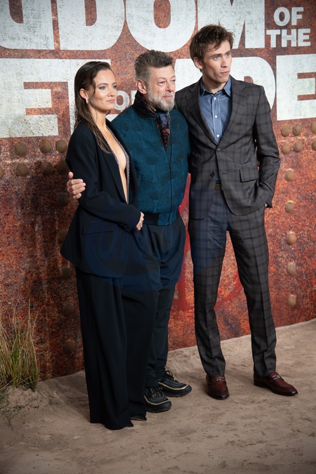 (L-R) - Freya Allan, Andy Serkis, Owen Teague attends a Preview of 'Kingdom of the Planet of the Apes' at BFI IMAX, London, England, UK on Thursday 25 April, 2024., Credit:Justin Ng / Avalon