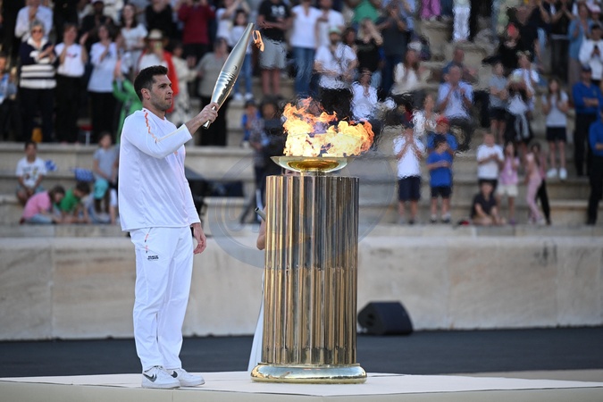 Ioannis Fountoulis - Passation de la flamme olympique de la Grèce à la France austade panathénaïque d'Athènes, Grèce, le 26 avril 2024. © Nikos Zagas/Bestimage Passing of the Olympic flame from Greece to France at the Panathenaic Stadium in Athens, Greece, on April 26, 2024.