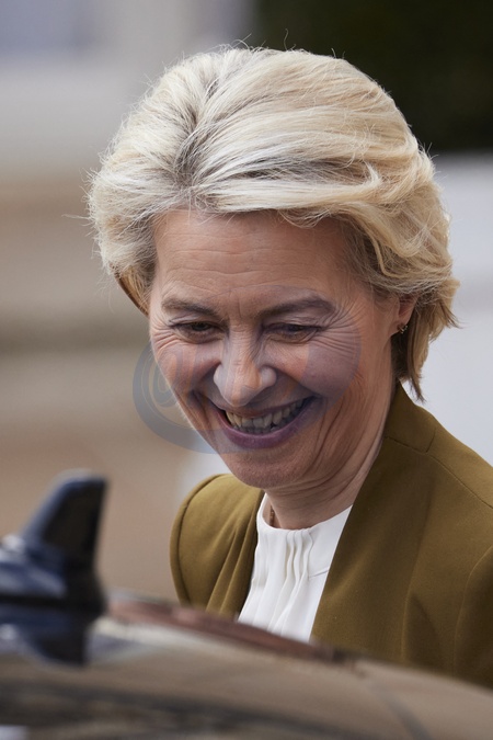 Le président de la République raccompagne la présidente de la Commission européenne Ursula Von Der Leyen après un entretien au palais présidentiel de l'Elysée à Paris, France, le 6 mai 2024. © Cyril Moreau/Bestimage French President accompanies European Commission president Ursula von der Leyen after a metting at the Elysee presidential palace in Paris, France, on May 6, 2024.