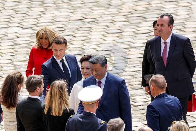 Prezydent Emmanuel Macron, Pierwsza Dama Brigitte Macron, Prezydent Xi Jinping i Pierwsza Dama Peng Liyuan podczas oficjalnej ceremonii powitania w Hôtel National des Invalides w Paryżu