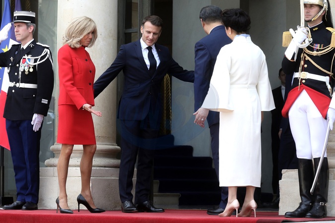 Prezydent Francji Emmanuel Macron i jego żona Pierwsza Dama Brigitte Macron witają Prezydenta Chin Xi Jinpinga i jego żonę Pierwszą Damę Peng Liyuan na dwustronnym spotkaniu w Pałacu Prezydenckim Elizejskim w Paryżu