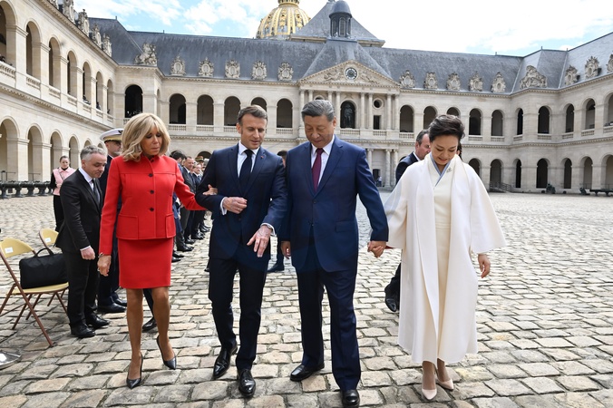 Prezydent Emmanuel Macron, Pierwsza Dama Brigitte Macron, Prezydent Xi Jinping i Pierwsza Dama Peng Liyuan podczas oficjalnej ceremonii powitania w Hôtel National des Invalides w Paryżu