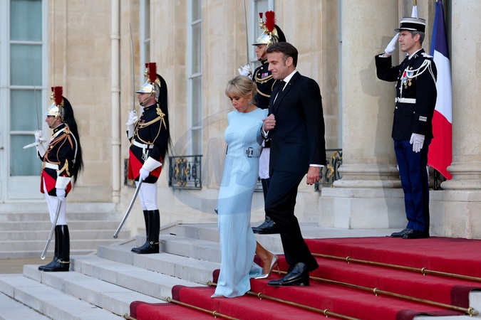 La Première Dame Brigitte Macron et son mari le président Emmanuel Macron - Arrivée des invités au dîner d'Etat en l'honneur du président chinois Xi Jinping et de sa femme la Première Dame Peng Liyuan au palais présidentiel de l'Elysée à Paris, France, le 6 mai 2024. © Cyril Moreau/Bestimage Celebs arrive to attend an official state dinner as part of the Chinese president's two-day state visit to France, at the Presidential Elysee Palace in Paris, France, on May 6, 2024.