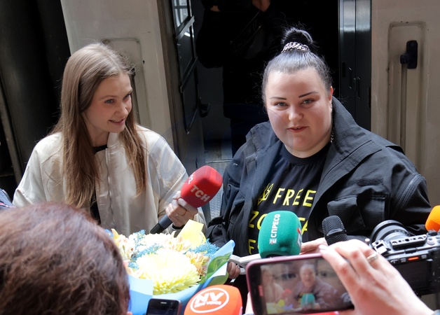 KYIV, UKRAINE - MAY 13, 2024 - Singer Alyona Alyona (R), one of Ukraine's representatives at the Eurovision Song Contest 2024, speaks with the press at the Central Railway Station upon her return, Kyiv, capital of Ukraine., Credit:Eugen Kotenko / Avalon