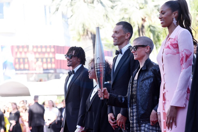 Arnaud Assoumani, Nélia Barbosa, Alexis Hanquinquant, Marie Patouillet et la flamme olympique, Iliana Rupert - Montée des marches du film « Marcello Mio » lors du 77ème Festival International du Film de Cannes, au Palais des Festivals à Cannes. Le 21 mai 2024 © Jacovides-Moreau / Bestimage Red carpet of the movie « Marcello Mio » during the 77th Cannes International Film Festival at the Palais des Festivals in Cannes, France. On may 21th 2024