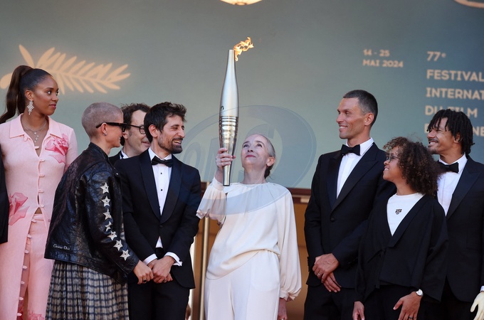 Iliana Rupert, Marie Patouillet, guest, Delphine Ernotte et la flamme olympique, Alexis Hanquinquant, Nélia Barbosa - Montée des marches du film « Marcello Mio » lors du 77ème Festival International du Film de Cannes, au Palais des Festivals à Cannes. Le 21 mai 2024 © Jacovides-Moreau / Bestimage Red carpet of the movie « Marcello Mio » during the 77th Cannes International Film Festival at the Palais des Festivals in Cannes, France. On may 21th 2024