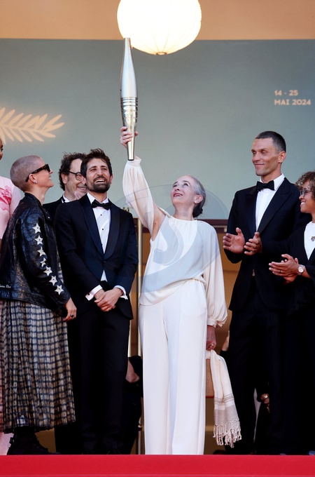 Marie Patouillet, guest, Delphine Ernotte et la flamme olympique, Alexis Hanquinquant, Nélia Barbosa - Montée des marches du film « Marcello Mio » lors du 77ème Festival International du Film de Cannes, au Palais des Festivals à Cannes. Le 21 mai 2024 © Jacovides-Moreau / Bestimage Red carpet of the movie « Marcello Mio » during the 77th Cannes International Film Festival at the Palais des Festivals in Cannes, France. On may 21th 2024