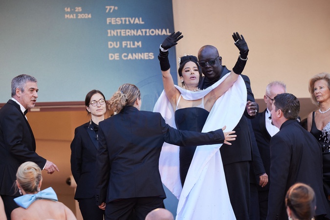 Une militante et des agents de la sécurité - Montée des marches du film « Le comte de Monte-Cristo » lors du 77ème Festival International du Film de Cannes, au Palais des Festivals à Cannes. Le 22 mai 2024 © Jacovides-Moreau / Bestimage Red carpet of the movie « Le comte de Monte-Cristo » during the 77th Cannes International Film Festival at the Palais des Festivals in Cannes, France. On may 22th 2024