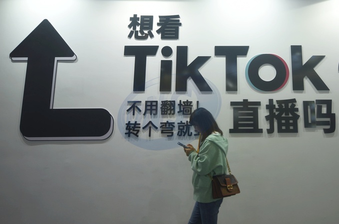 A woman walks by a billboard for TikTok during a trade show for tech companies in Hangzhou in east China's Zhejiang province Thursday, Nov. 23, 2023., Credit:LONG WEI / Avalon