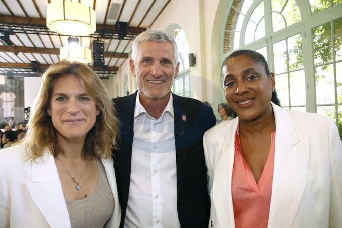 Amélie Mauresmo (Directrice du Tournoi), GillesMoretton (Président de la Fédération Française de Tennis) et Marie-José Pérec - Tirage au sort des Internationaux de France de Tennis de Roland Garros 2024 à Paris le 23 mai 2024. © Bertrand Rindoff / Bestimage Draw for the 2024 French Open Tennis Championships at Roland Garros in Paris on May 23, 2024.