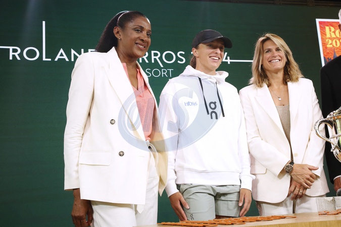 Marie-José Pérec, Iga Swiatek (Joueuse polonaise, numéro 1 mondiale) et Amélie Mauresmo (Directrice du Tournoi) - Tirage au sort des Internationaux de France de Tennis de Roland Garros 2024 à Paris le 23 mai 2024. © Bertrand Rindoff / Bestimage Draw for the 2024 French Open Tennis Championships at Roland Garros in Paris on May 23, 2024.