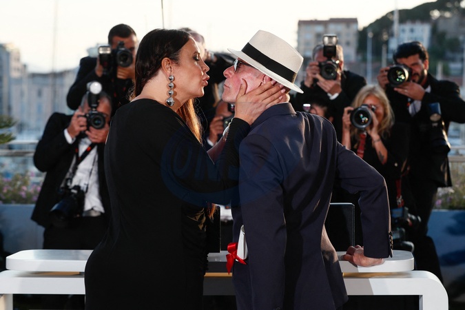 Karla Sofia Gascon (Prix d'interprétation féminine pour «Emilia Perez» - Palme collective : S.Gomez, Z.Saldana, A.Paz), Jacques Audiard (Prix du jury pour «Emilia Perez») - Photocall des palmes lors du 77ème Festival International du Film de Cannes au Palais des Festivals à Cannes. Le 25 mai 2024 © Christophe Clovis / Bestimage Photocall of the awards winners of the 77th Cannes International Film Festival at the Palais des Festivals in Cannes, France. On may 25th 2024