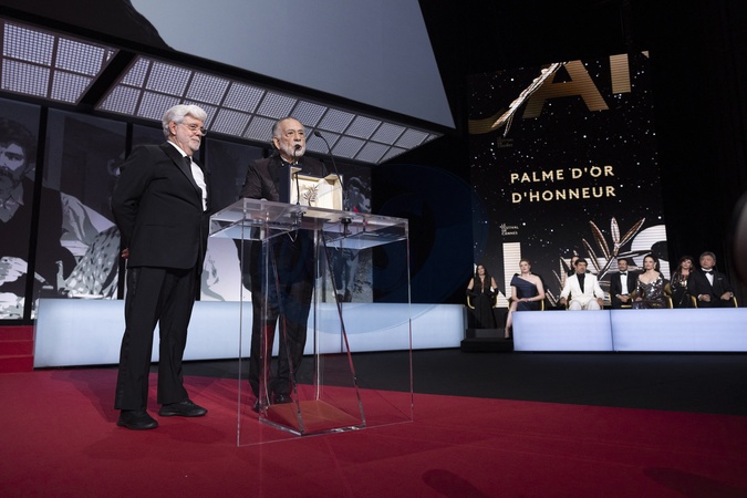 George Lucas (Palme d'or d'honneur), Francis Ford Coppola - Cérémonie de clôture du 77ème Festival International du Film de Cannes au Palais des Festivals à Cannes. Le 25 mai 2024. © Borde-Jacovides-Moreau / Bestimage Closing ceremony of the 77th Cannes International Film Festival at the Palais des Festivals in Cannes, France. On may 25th 2024