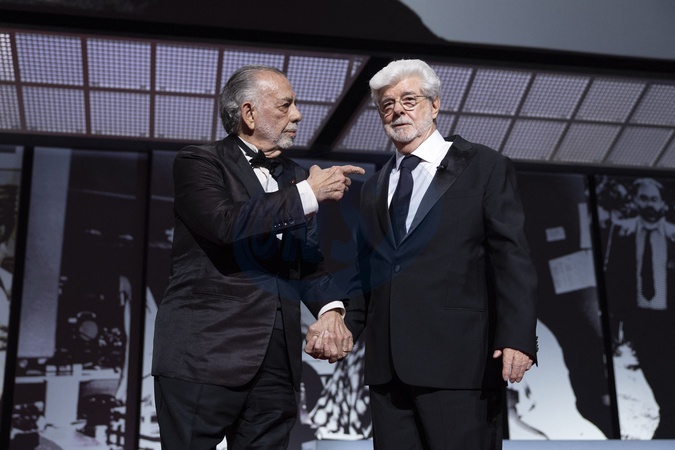 George Lucas (Palme d'or d'honneur), Francis Ford Coppola - Cérémonie de clôture du 77ème Festival International du Film de Cannes au Palais des Festivals à Cannes. Le 25 mai 2024. © Borde-Jacovides-Moreau / Bestimage Closing ceremony of the 77th Cannes International Film Festival at the Palais des Festivals in Cannes, France. On may 25th 2024