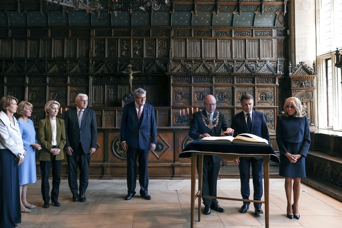 Le président Emmanuel Macron et la première dame Brigitte Macron accueilis par Franck-Walter Steinmeier, président de la république fédérale d'Allemagne et madame Elke Budenbender et Von Der Leye pour la signature du livre d'or à Munster