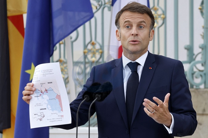 Le chancelier allemand Olaf Scholz et le président français Emmanuel Macron en conférence de presse au palais Schloss Meseberg à Meseberg, dans l'est de l'Allemagne, le 28 mai 2024. © Ludovic MARIN/Pool/Bestimage France's President Emmanuel Macron shows a map of the border between Ukraine and Russia during a joint press conference with German chancellor at the Schloss Meseberg palace in Meseberg, eastern Germany, on May 28, 2024.