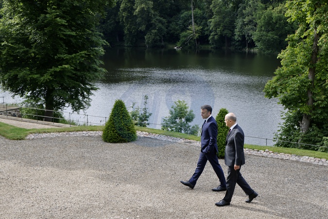 Le chancelier allemand Olaf Scholz et le président français Emmanuel Macron au palais Schloss Meseberg à Meseberg, dans l'est de l'Allemagne, le 28 mai 2024. © Ludovic MARIN/Pool/Bestimage German Chancellor Olaf Scholz (R) walks with France's President Emmanuel Macron upon latter's arrival at the Schloss Meseberg palace in Meseberg, eastern Germany, on May 28, 2024.