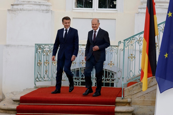 Kanclerz Niemiec Olaf Scholz i prezydent Francji Emmanuel Macron na konferencji prasowej w pałacu Schloss Meseberg