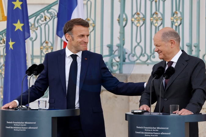 Le chancelier allemand Olaf Scholz et le président français Emmanuel Macron en conférence de presse au palais Schloss Meseberg à Meseberg, dans l'est de l'Allemagne, le 28 mai 2024. © Ludovic MARIN/Pool/Bestimage German Chancellor Olaf Scholz (R) and France's President Emmanuel Macron attend a press conference at the Schloss Meseberg palace in Meseberg, eastern Germany, on May 28, 2024.