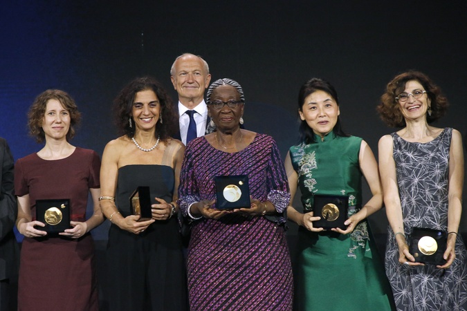 Exclusif - Professeure Alicia Kowaltowski (Biochimie, Brésil), Lauréate pour l'Amérique Latine et les Caraïbes, Professeure Nada Jabado (Génétique humaine, Canada), Lauréate pour l'Amérique du nord, Professeure Rose Leke (Immunologie, Cameroun), Lauréate pour l'Afrique et les Etats Arabes, Professeure Nieng Yan (Biologie structurelle, Chine), Lauréate pour l'Asie et le Pacifique et Professeure Geneviève Almouzni (Biologie moléculaire, France), Lauréate pour l'Europe avec Jean-Paul Agon (PDG du Groupe L'Oréal) - Prix International L'Oréal-UNESCO pour les Femmes et la Science à l'UNESCO à Paris le 28 Mai 2024. © Bertrand Rindoff / Bestimage Exclusive - For Germany call for price - Ceremony of the L'Oréal-UNESCO for Women in Science Awards Ceremony at UNESCO in Paris, France on May 28, 2024.