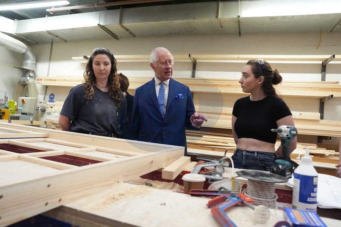 King Charles III, Patron of the Royal Academy of Dramatic Art (RADA), tours the Scenic Art Studio during a visit to RADA in London, to celebrate the school's 120th anniversary. Picture date: Wednesday May 29, 2024. PA Photo. See PA story ROYAL King. Photo credit should read: Jordan, Credit:Jordan Pettitt / Avalon