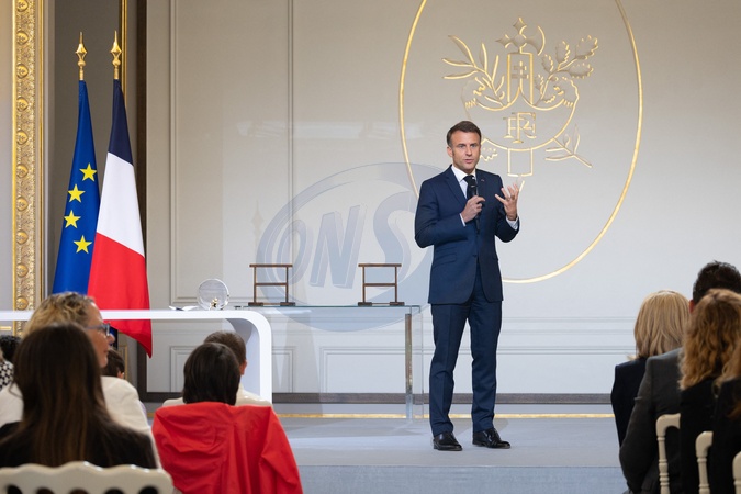 Prezydent Republiki Francuskiej Emmanuel Macron i pierwsza dama Brigitte Macron wręczają nagrody „Nie molestowaniu 2024” w Pałacu Elizejskim w Paryżu
