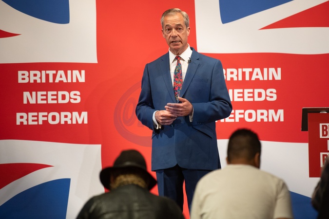 Nigel Farage speaking at Reform UK's immigration policy launch to tax employers for using migrants at a Glaziers Hall, London, England, UK on Thursday 30 May, 2024., Credit:Justin Ng / Avalon