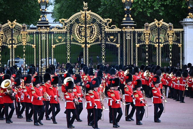 Queen Victoria Memorial, London, UK. 1st June, 2024. The Major General's Review of the Trooping of the Colour for the King's Birthday Parade takes place. This rehearsal is the first of two formal reviews in full dress uniform of the troops and horses before parading for HM The King's Official Birthday Parade on the 15th June. The soldiers are inspected by Major General James Bowder OBE, The Major General Commanding the Household Division. Photograph of the event from the Queen Victoria Memorial in front of Buckingham Palace., Credit:MALCOLM PARK / Avalon