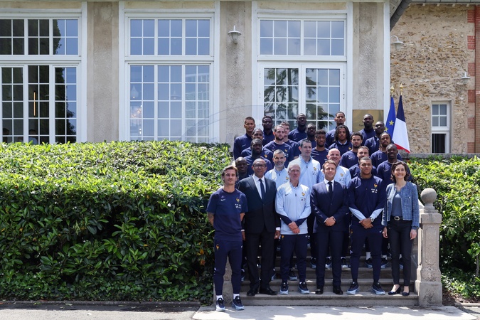 Antoine Griezman, Philippe Diallo, Didier Deschamps, Kylian Mbappé, Amélie Oudéa-Castéra et l'équipe de France - Le président français, Emmanuel Macron se rend auprès de l'équipe de France masculine de football, au Centre National du Football de Clairefontaine, à Clairefontaine-en-Yvelines. Le 3 juin 2024. © Stéphane Lemouton / Bestimage French president at the National Football Center in Clairefontaine. On June 3rd 2024