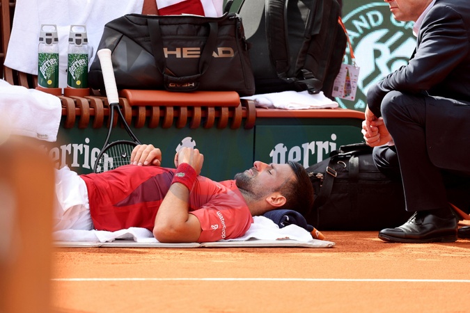 Novak Djokovic konsultuje się ze swoim fizjoterapeutą podczas turnieju tenisowego French Open na Roland Garros 2024 w Paryżu