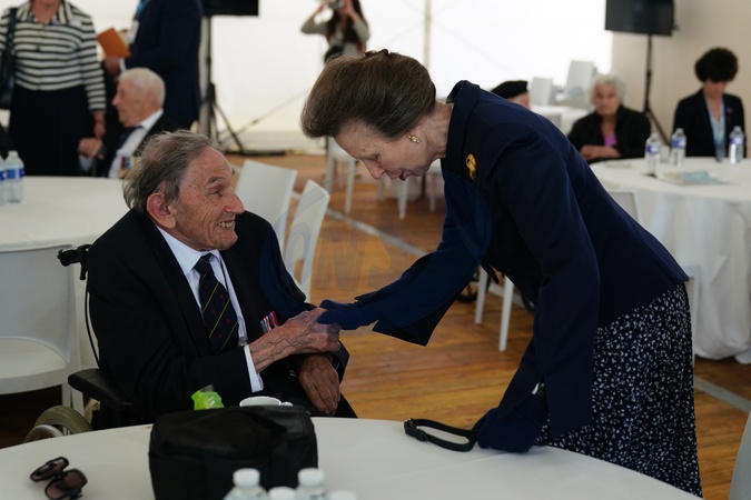 The Princess Royal talks with a veteran at the Royal British Legion Service of Commemoration to mark the 80th anniversary of D-Day, at Bayeux War Cemetery in Normandy, France. Picture date: Wednesday June 5, 2024. PA Photo. See PA story MEMORIAL DDay. Photo credit should read: Aaron, Credit:Aaron Chown / Avalon