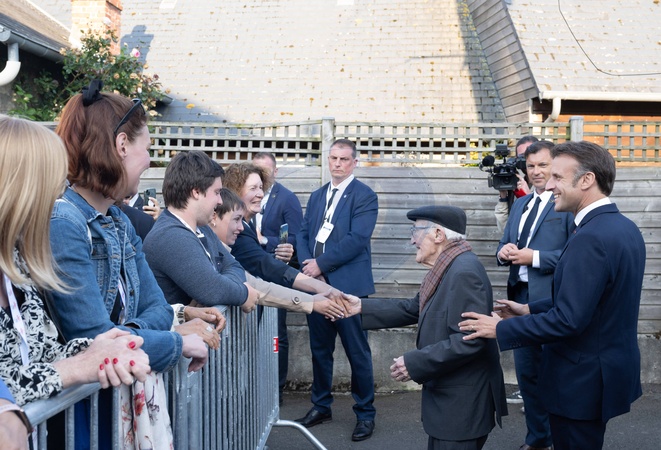 80ème anniversaire du débarquement (D-Day) : Le président Emmanuel Macron rend hommage aux massacrés de la prison de Caen avec Bernard Duval, rescapé de cet épisode tragique