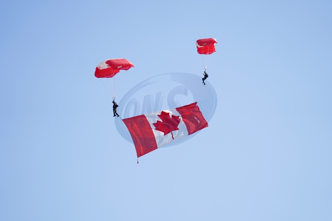 Parachuters drop over the event ahead of the Government of Canada ceremony to mark the 80th anniversary of D-Day, at Juno Beach in Courseulles-sur-Mer, Normandy, France. Picture date: Thursday June 6, 2024. NO UK USE FOR 48 HOURS, Credit:Avalon.red / Avalon