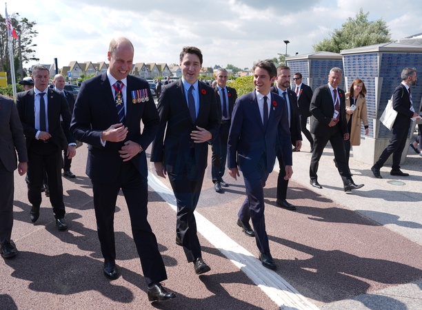 The Prince of Wales, Canadian Prime Minister Justin Trudeau and Prime Minister of France Gabriel Attal ahead of the Government of Canada ceremony to mark the 80th anniversary of D-Day, at Juno Beach in Courseulles-sur-Mer, Normandy, France. Picture date: Thursday June 6, 2024. NO UK USE FOR 48 HOURS, Credit:Avalon.red / Avalon