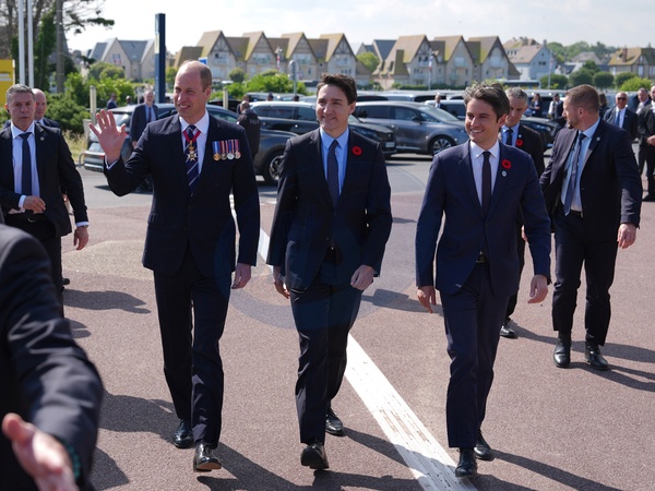 The Prince of Wales, Canadian Prime Minister Justin Trudeau and Prime Minister of France Gabriel Attal ahead of the Government of Canada ceremony to mark the 80th anniversary of D-Day, at Juno Beach in Courseulles-sur-Mer, Normandy, France. Picture date: Thursday June 6, 2024. NO UK USE FOR 48 HOURS, Credit:Avalon.red / Avalon