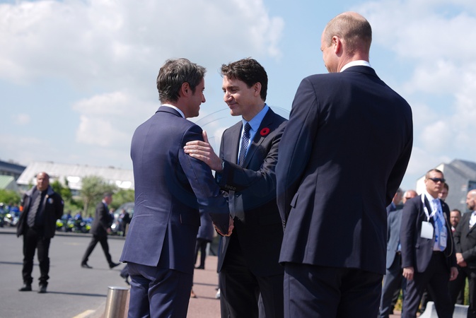 The Prince of Wales and Canadian Prime Minister Justin Trudeau meet Prime Minister of France Gabriel Attal ahead of the Government of Canada ceremony to mark the 80th anniversary of D-Day, at Juno Beach in Courseulles-sur-Mer, Normandy, France. Picture date: Thursday June 6, 2024. NO UK USE FOR 48 HOURS, Credit:Avalon.red / Avalon