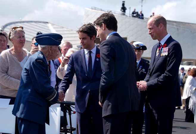 Prime Minister of France Gabriel Attal meets Richard Rohmer, 100, one of the most decorated Canadian veterans, accompanied by the Prince of Wales and Canadian Prime Minister Justin Trudeau, at the Government of Canada ceremony to mark the 80th anniversary of D-Day, at Juno Beach in Courseulles-sur-Mer, Normandy, France. Picture date: Thursday June 6, 2024. NO UK USE FOR 48 HOURS, Credit:Avalon.red / Avalon