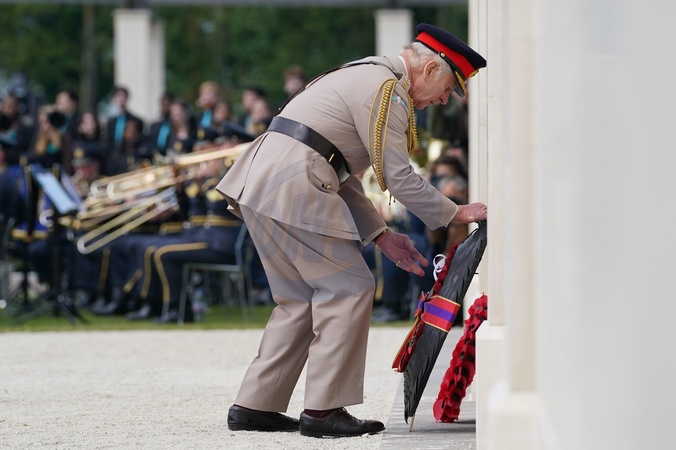 King Charles III lays a wreath during the UK national commemorative event for the 80th anniversary of D-Day, held at the British Normandy Memorial in Ver-sur-Mer, Normandy, France. Picture date: Thursday June 6, 2024. It is the first time the memorial, which contains the names of the 22,442 servicemen and women under British command who fell on D-Day and during the Battle of Normandy in the summer of 1944, has been used for major anniversary commemorations, after having been opened in 2021. NO UK USE FOR 48 HOURS, Credit:Avalon.red / Avalon