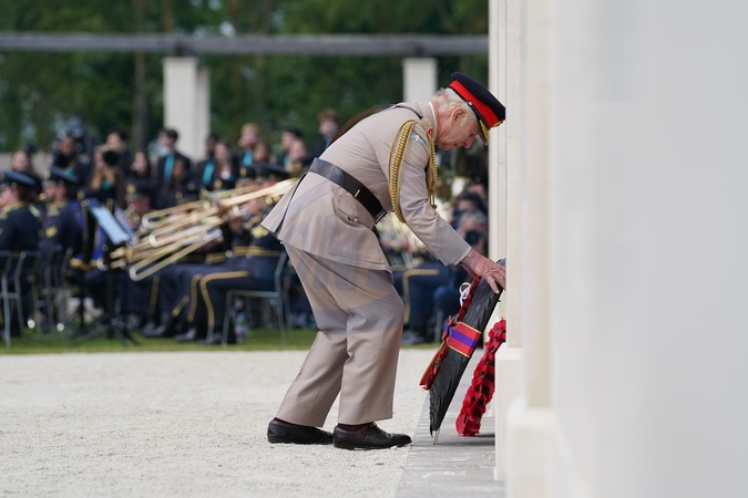 King Charles III lays a wreath during the UK national commemorative event for the 80th anniversary of D-Day, held at the British Normandy Memorial in Ver-sur-Mer, Normandy, France. Picture date: Thursday June 6, 2024. It is the first time the memorial, which contains the names of the 22,442 servicemen and women under British command who fell on D-Day and during the Battle of Normandy in the summer of 1944, has been used for major anniversary commemorations, after having been opened in 2021. NO UK USE FOR 48 HOURS, Credit:Avalon.red / Avalon