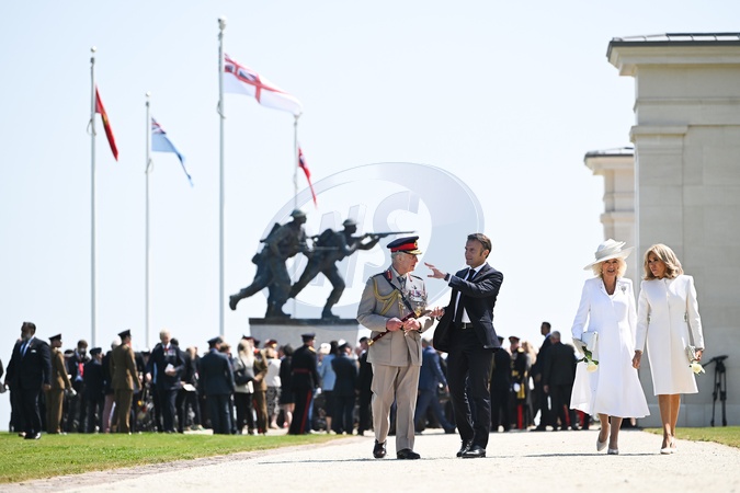 King Charles III,Queen Camilla, President of France Emmanuel Macron and Brigitte Macron during the UK national commemorative event for the 80th anniversary of D-Day, held at the British Normandy Memorial in Ver-sur-Mer, Normandy, France. Picture date: Thursday June 6, 2024. It is the first time the memorial, which contains the names of the 22,442 servicemen and women under British command who fell on D-Day and during the Battle of Normandy in the summer of 1944, has been used for major anniversary commemorations, after having been opened in 2021. NO UK USE FOR 48 HOURS, Credit:Eddie Mulholland / Avalon