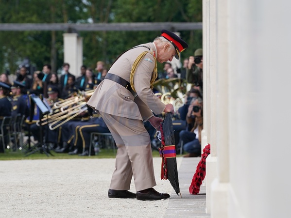 King Charles III lays a wreath during the UK national commemorative event for the 80th anniversary of D-Day, held at the British Normandy Memorial in Ver-sur-Mer, Normandy, France. Picture date: Thursday June 6, 2024. It is the first time the memorial, which contains the names of the 22,442 servicemen and women under British command who fell on D-Day and during the Battle of Normandy in the summer of 1944, has been used for major anniversary commemorations, after having been opened in 2021. NO UK USE FOR 48 HOURS, Credit:Avalon.red / Avalon
